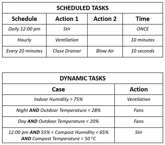 Regardless of sensor values, a number of tasks have to be periodically performed to maintain material integrity. In more detail, the IoT gateway stirs the material three times a day to homogenize the possible periodically added waste (municipal employees add waste once or twice a day), and allow more oxygen to flow within the pile, thus enhancing microbial activity. While the pile is being stirred, hot air and methane are emitted. Thus, the ventilation system must be activated to work in parallel. Additionally, since methane is constantly being emitted by the compost material, ventilation is also activated every hour for 10 minutes. The assigned tasks are sent to the IoT Gateway for execution by the composting service. There are two types of tasks: on the one hand, there are the scheduled tasks that are executed at certain times, and on the other hand, there are the dynamic tasks that are both time- and sensor-dependent. Figure 8 illustrates the notion of scheduled and dynamic tasks that are assigned to the IoT gateway for execution.