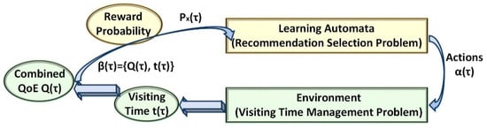 Figure 1 presents the examined RSVTM problem as a learning system. Each museum visitor/learning automaton (where denotes the set of visitors) at each operation time slot of the reinforcement learning framework/loop has a set of actions . Each action represents a different choice x of recommendation selection for his/her museum tour. Towards making their decision, museum visitors consider the museum environment and specifically the output set where and are the vectors of the combined QoE and visiting time of all museum visitors that are simultaneously in the museum. The output is determined from the visiting time management framework. The solution to the visiting time management problem results in visitors’ optimal visiting time. Based on the chosen actions of the visitors and the corresponding reaction of their environment, we are able to determine the reward probability , which is associated with the action . The reward probability represents the penetration of the Rxth recommendation in the pool of museum visitors. The action probability vector of a museum visitor/learning automaton is where each one of its elements expresses the probability of selecting the Rxth recommendation and is determined based on the model of learning automata.