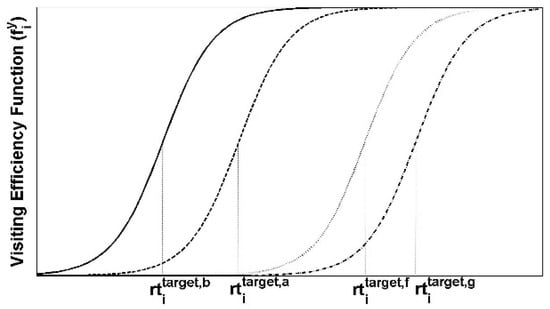 Specifically, the achievable pure QoE function is formulated as a sigmoidal function with respect to the relative visiting time ratio , i.e., where the notation shows the visiting style of the visitor, i.e., ant (a), butterfly (b), fish (f), and grasshopper (g). The visiting efficiency function represents visitor’s perceived satisfaction and depends on the museum congestion as well as on the time that he/she invests in the museum visit. For analysis purposes, a common sigmoidal function is adopted, i.e., , where are positive parameters controlling the slope of the visiting efficiency function to guarantee the relative positions of the visiting efficiency functions, which is presented in Figure 2.