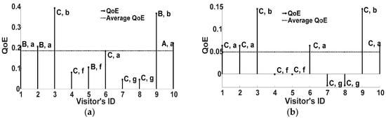 Visitors’ QoE as a function of their ID (a) under the RSVTM algorithm and (b) assuming that all visitors select the best recommendation (Recommendation C) in terms of potentially achieved QoE.