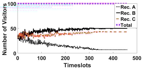 Subsequently, a larger and more representative experiment was executed by considering 100 museum visitors (i.e., 25 visitors from each visiting style) with ). Our aim is to better demonstrate the operation and behavior of the RSVTM algorithm in terms of several performance parameters and tradeoffs such as convergence, achieved QoE, visiting time, etc. Specifically, Figure 4 illustrates the convergence of the visitors to their selected recommendation, i.e., A, B, and C as a function of the time slots of the recommendation selection part of the RSVTM algorithm. The results reveal that the RSVTM algorithm converges to a stable operation point where all visitors select their recommendation in an autonomous and distributed manner. The RSVTM algorithm converges to the stable point in less than 400 timeslots (and for practical purposes significantly less than 300 slots), which, in real time, is translated to less than 3.7 s. Furthermore, it is observed that the majority of visitors select the recommendation B and C, which are more enhanced when compared to the recommendation A, i.e., map of the museum provided to visitors at the entrance. It is noted that, if additional visitors were present and recommendations B and C were seriously populated, then recommendation A would become more attractive as the system and time evolves.