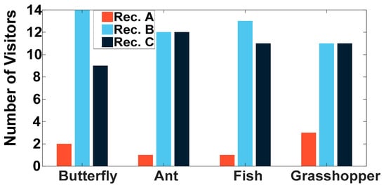 Figure 5 depicts the number of visitors from each visiting style and the recommendation type they selected. It is shown that visitors’ distribution in the recommendations follows similar trends for each visiting style. Thus, there is no case where visitors of a specific visiting style show preference for specific recommendations. Therefore, the behavior of visitors is homogeneous with respect to the recommendation selection even if they belong to different visiting styles and the choices are primarily influenced by the congestion factor and problem.