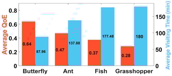 With reference to the same setting and experiment, Figure 6 shows the average visitor QoE and the corresponding average visiting time of the four different visiting styles, i.e., ant, butterfly, fish, and grasshopper. The visitors who have greater flexibility and tolerance with respect to the museum congestion, i.e., smaller values of target relative visiting time, are able to achieve greater QoE levels by spending less time to their museum visit. Therefore, combining our findings and observations from both Figure 2 and Figure 6, we conclude that butterfly-style visitors are the most tolerant of congestion. Therefore, they achieve the highest QoE while spending the shortest visiting time on their museum tour. Ant, fish, and grasshopper visitors follow with decreasing QoE levels and corresponding increasing visiting times due to the fact that .