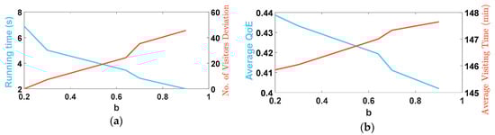 (a) RSVTM Running time and number of visitors’ deviation (with respect to b = 0.2) vs. learning rate b. (b) Average QoE and average visiting time vs. learning rate b.