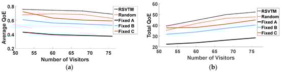 Aiming at providing indicative scalability results of the RSVTM framework while, at the same time, evaluating the performance of all the proposed approaches with varying visitor numbers. We consider increasing the number of visitors within the museum. We performed a detailed Monte Carlo analysis for the different sets of visitors by running 1000 runs of each comparative scenario. Figure 8a,b present visitors average QoE and total achieved QoE, respectively, as a function of the number of visitors in the museum. The results reveal that the fixed choice of the recommendation by visitors, i.e., Fixed A, Fixed B, and Fixed C scenarios, concludes to lower average and total QoE values when compared to the RSVTM framework due to the increased congestion at each recommendation when considered in isolation. The random choice of recommendation concludes an almost uniform distribution of visitors for the recommendations. Thus, the corresponding congestion phenomenon is limited or eliminated. Nevertheless, the random scenario achieves comparable results with respect to the QoE values with a fixed C scenario where, at the latter one, all the visitors selected the best available recommendation C in expectation of enjoying the highest possible satisfaction. In contrast to all the other four examined scenarios, the RSVTM framework demonstrates superior results regarding both the average and the total QoE values since it enables visitors to dynamically sense the congestion of each recommendation and make the most beneficial recommendation choice that will maximize their perceived QoE. In our framework, to maintain generality and flexibility, we did not a priori correlate visiting styles with recommendation types, but we let visitors select the recommendation type as the system evolves and based on the current conditions. Such an approach, besides its general applicability under different recommendation types and environments, typically leads to a more balanced distribution of the visitors among the recommendation types especially in cases of different visitor distributions and mix of visitor styles. This way, we avoid cases where all visitors would select a specific type of recommendation, which would negatively affect the museum operation. Furthermore, as expected, the average QoE decreases as the number of visitors increases for all the comparative scenarios due to the increased museum congestion, which presents higher costs in order to enjoy a recommendation and forces visitors to invest higher visiting times for their museum tour.