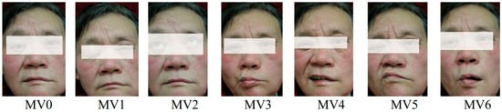 Sajid et al. [] used a CNN model to classify face images with FNP into the five distinct degrees established by House and Brackmann. Sajid used GAN to prevent overfitting in training (Column 3, VGG-16 Net with GAN). Neely [] used a computerized objective measurement of facial motion to obtain diagnosis of facial paralysis; using a standardized classification method, he achieved an accuracy of 95% (Columns 4). HC et al. [] used optical-flow tracking and texture analysis methods to solve the problem. They used advanced image processing technology to capture the asymmetry of facial movements by analyzing the patients’ video data and then used several different classification methods to diagnose FNP. The result is shown in Table 2 (Columns 5–6, RBF with 0/1 disagreement). Wang et al. [,] presented a novel method for grading facial paralysis integrating both static facial asymmetry and dynamic transformation factors. Wang used an SVM with the RBF kernel function to quantify the static facial asymmetry on images using five of the six facial movements (MV1–6), but they did not measure accuracy of MV0. The results are shown in column 7 of Table 8.