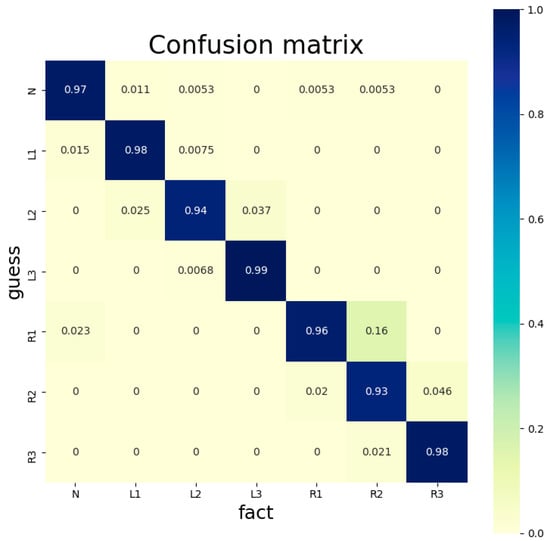 By analyzing the confusion matrix, one can observe that the proposed method can predict the FNP types well. The highest classification accuracy was 0.993, achieved for L3, while the lowest classification accuracy was 0.933 for R2. It can be seen that the accuracy is very high for the most serious disease conditions (R3 and L3), but the accuracy is not very high for intermediate disease conditions (R2 and L2). The overall accuracy was 97.5%.