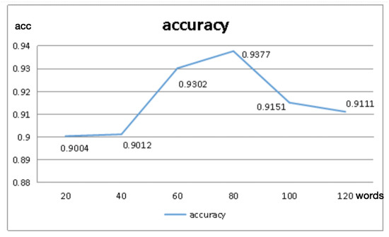 - The length of theIn the initialization and padding of word vectors, the parameter, maxlen, was set up to determine the length of the words that are chosen to represent the article. As for SST-1 and SST-2 datasets, the average length of articles are 18, and the length is so short that it is difficult to obtain the different influences of the article length. Therefore, the THUCNews dataset is selected for an experiment to find out the effect of article length. Figure 4 shows that different lengths of the articles result in different performance.