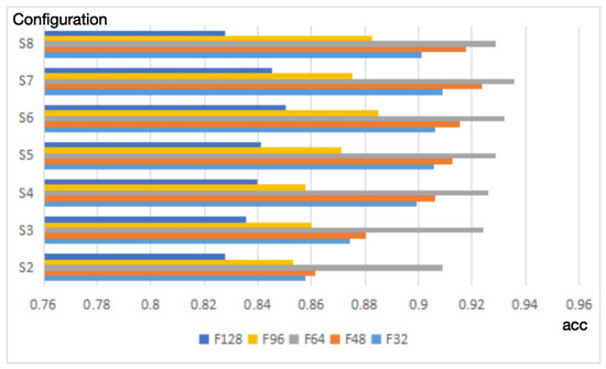 Figure 4. Accuracy vs. article length.The best result, 93.77%, occurs when 80 words are employed to represent the article, which is also deemed as the closest length to the average article length of the dataset. Once the maxlen is far greater than the average length of the articles, then the accuracy will decrease greatly because many more zero vectors will exist in the vectors of the article. - The size of Convolutional FilterIn Figure 5, different convolution filter configurations are adopted to present the prediction accuracy on the question classification. As for the horizontal axis, the number indicates convolutional kernel size, and bar charts of five different colors on each filter size represent different dimensions of the convolution output. For example, “S8” means that the size of the kernel is 8 while “F128” denotes that the dimension of the convolution output is 128. It is quite obvious that the dimension of 64 outperforms the other dimensions and the best result, the accuracy of 93.55%, occurs when the window size is 7.