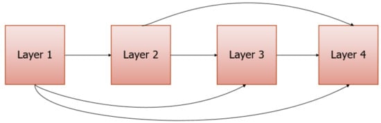 A densely connected convolutional network (DenseNet) is a convolution network for image classification. Usually, when a convolution network is deeper and deeper, the information of input and gradient will gradually disappear after passing through several layers. However, this problem can be solved by DenseNet with dense connections. It directly connects all the layers in the network using the same size feature maps to ensure the maximum information flow between the layers. Each layer requires information from all previous layers as input, and then it passes its feature maps to all subsequent layers. By using dense connections, the DenseNet architecture allows for better information and gradient flow during training. The dense connections structure is shown in Figure 2.