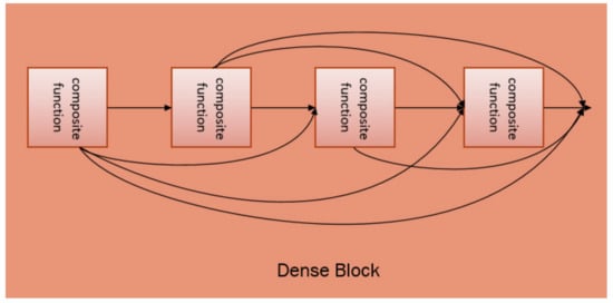 The DenseNet is mainly composed of several dense blocks and transition layers as a whole. Each dense block contains several composite functions. These composite functions are connected to each other through dense connections. The composite function consists of three consecutive operations: BN [], followed by ReLU [], and finally a convolution layer. ReLU is an activation function of the CNN, which is defined as: