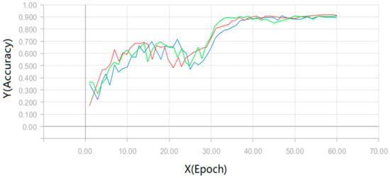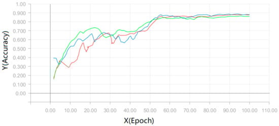 In the test, we experimented on each configuration 10 times, and then took their average as the mean accuracy of our experiment. The test mean accuracy of our model can be found in Figure 6 and Figure 7. In Figure 6, we export the test results of the three sets of configurations in the KTH dataset. The three sets of configurations come from Table 1. The red line represents the output of a network depth of 20 and a growth rate of 24. The blue line represents the output of a network depth of 20 and a growth rate of 12. The green line represents the output of a network depth of 30 and a growth rate of 12. In Figure 7, we output the test results of the three sets of configurations on the UCF101 dataset. Similarly, these configurations come from Table 1, where the red line represents the output of the configuration with a network depth of 20 and a growth rate of 12. The blue line represents the output of the configuration with a network depth of 20 and a growth rate of 24. Finally, the green line represents the output of the configuration with a network depth of 30 and a growth rate of 12.