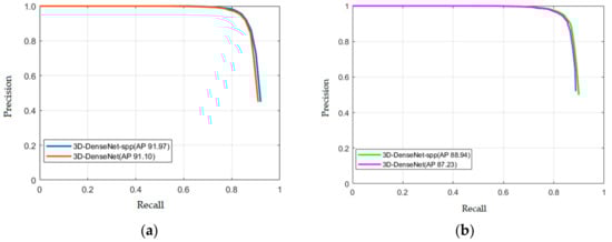 (a) Precision-recall (PR) curves of 3D-DenseNet-SPP and 3D-DenseNet on the KTH dataset. (b) PR curves of 3D-DenseNet-SPP and 3D-DenseNet on the UCF101 dataset.