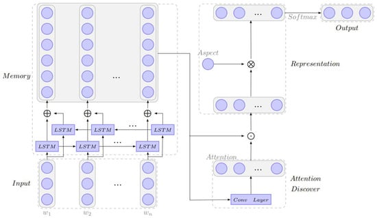 The architecture of AARCNN model is shown in Figure 1, which consists of five parts: input module, memory module, attention discover module, representation module and output module. Suppose the input comment sentence is where is the word of the sentence; the goal is to classify the sentiment polarity of each aspect of the comment. For example, given the comment “The food is not cheap but very delicious”, the output should indicate that it is negative in the “FOOD#PRICE” aspect and is positive in the “FOOD#TASTE” aspect.