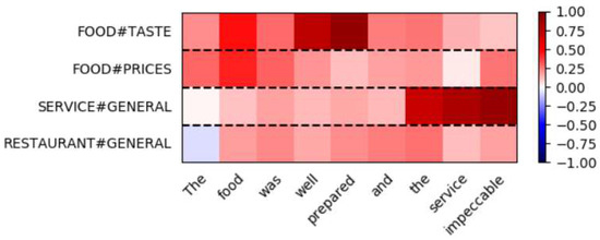 We analyzed a comment sentence “The food was well prepared and the service impeccable” as a case study. The true annotation of the sentence is positive in FOOD#TASTE and positive in SERVICE#GENERAL. Besides the two true aspects, two wrong aspects are also chosen in the test, which are RESTAURANT#GENERAL and FOOD#PRICE. RESTAURANT#GENERAL is weakly relevant to the sentence and FOOD#PRICE is totally irrelevant to the sentence. Figure 4 shows the final representation of the sentence under the four circumstances. The red color in the figure is the signal of positive sentiment and the blue represents negative sentiment.