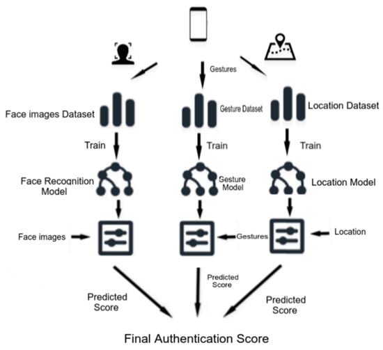 In this paper, we suggest a face-authentication system consisting of face, gesture and location recognition as components. The proposed system is shown in Figure 3. For each component, necessary data for training and validation is collected and stored on the corresponding dataset. Training data from each dataset is used to train the corresponding model. After the face, gesture and location recognition model is trained and validated, they can be used for making corresponding predictions. At the end, three prediction scores corresponding to the three components yield the final authentication score.