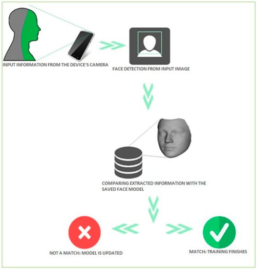 User face recognition consists of a comparison between the extracted characteristics of the face from images taken with the camera with the saved recognition model, as presented in Figure 7. Depending on the result of the comparison, the recognition mode either results in successful user authentication or not. Recognition is achieved in two phases: