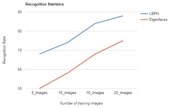 Recognition statistics’ chart for Eigenfaces and Local Binary Patterns Histograms (LBPH)