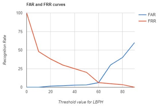 The statistics in the chart of the False Accept Rate (FAR) and False Reject Rate (FRR) analysis of the LBPH algorithm’s performance in recognition were obtained using 20 images of the user’s face to create the model. As can be concluded from the chart, presented in Figure 9, the Equal Error Rate is at 6 with the threshold’s value set at 60, thus achieving a recognition rate of 88%.