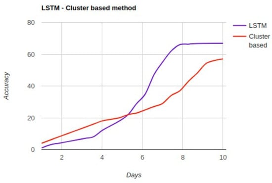 Figure 10 shows that both methods have a “cold start” with a low accuracy in the beginning. This can be justified based on the low amount of training data in the beginning. Moreover, in the beginning, the cluster-based method has a better performance than LSTM. With time passing, more data is collected on mobile phones from user interaction with their phones. After a couple of days, both methods have increased accuracy. Based on Figure 10, LSTM has a higher accuracy in comparison with the cluster-based method. After a specific time, the methods do not have any major increase on their accuracy, with the LSTM outperforming the cluster-based method on gesture recognition.
