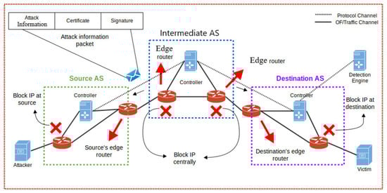SDN bring us a new approach to deal with DDoS attacks [7,8,9]. The separation of control and data plane in SDN allows us to write the control logic and instruct the forwarding plane to behave accordingly. This programmability gives us more control of the network traffic which was not possible before the advent of SDN. In [10], Giotis et al. proposed a DDoS mitigation scheme across multiple SDN domains or networks (Domain(s) and Network(s) are used interchangeably throughout this paper). The mitigation process starts from the victim network and propagates along the way towards the source. They extended the border gateway protocol (BGP) to embed the incident report as URIs within BGP signals. This reliance on BGP has some ramifications. First of all, BGP is very complex and hard to master, and any modifications to existing protocol will challenge the deployment. Secondly, the exchange of incident report between adjacent domains is not instantaneous and will only take place after every BGP update interval. Therefore, the report latency will increase with the number of hops between the source and victim of attacks. Further, they do not validate the authenticity of incident reports exchanged among the adjacent SDN domains. This could make the whole infrastructure vulnerable to fake incident reports from malicious domains.