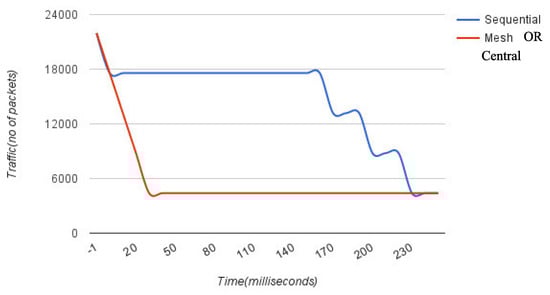 Figure 7a show the results for testbed with four networks. At time −1 the attack is being carried out, so the amount of traffic in all four networks is at the maximum volume. At time zero, our destination network receives the attack definitions via detector node. The SDN controller at the destination node verifies the authenticity of the attack definitions from the detector node and upon success installs the flows. Due to this, we observed a traffic drop at the destination network and the number of accepted packets are reduced to only the legitimate ones i.e., 4392. At this moment, the amount of packets flowing through other networks remains the same. After installing the flows in its own network, the SDN controller at the destination network forwards the attack definitions to the neighboring network i.e., network 1. Network 1 validates the source of the message and installs the flows. Due to which at time 12.66 ms there is a decrease in the traffic at network 1. Network 1 follows the same pattern and forwards the attack definitions to its neighbor i.e., network 2. Network 2 follows the same steps too and at time 40.4 ms the traffic flow drops to normal only allowing the legitimate traffic to pass through. This continues until network 2 forwards the attack definition to the source network. At time 71.6 ms, the source network installs the flows and the traffic drops to the legitimate traffic only. In the end, the attack has been mitigated not only from the destination network, but all the way to the source with the help of collaborative propagation of the attack definitions. Here, we also observed that the validation and processing of small size attack definitions has a trivial impact on the latency.