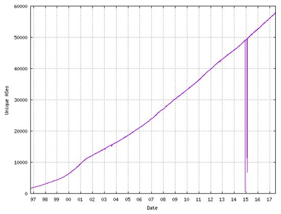 - Number of ASes in Routing System. Available online: http://www.cidr-report.org/as2.0/ (accessed on 15 December 2017).