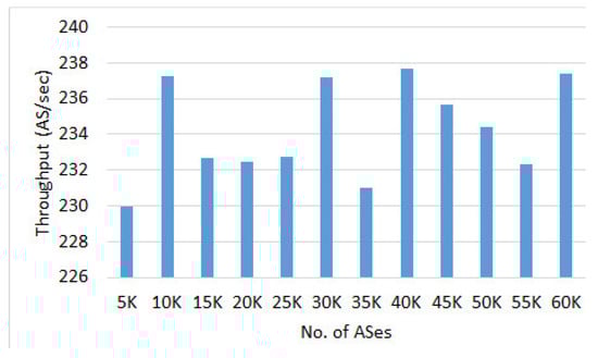 Figure 14 shows the throughput in terms of number of ASes handled per second. The average throughput remained fairly constant throughout the experiment and we were able to forward the attack definitions to 230–237 ASes per second. This is equivalent to disseminating 23 million malicious IP addresses per sec.