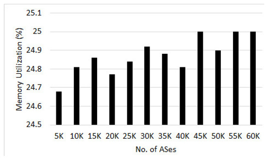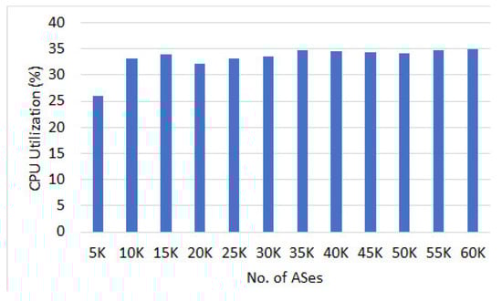 We also evaluated the CPU and memory utilization while measuring the effect of different AS counts. The average CPU utilization results (see Figure 15) show that the dissemination of attack definition with central control platform is not CPU intensive and it remained between 26% to 35%. Similarly, memory utilization remained constant between 24% to 25% in all the scenarios (see Figure 16).