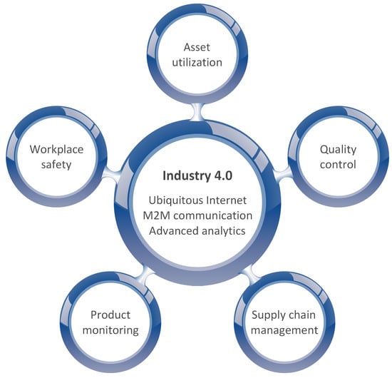 The birth of the fourth industrial revolution, namely Industry 4.0, is assumed to coincide with the Industrie 4.0 initiative []. Industrie 4.0 is a strategic initiative included by the German government as part of its High-Tech Strategy 2020 Action Plan, according to which the Internet-based technologies are used to improve all industrial processes, from manufacturing to distribution, from sales to post-sales. In the same period, similar initiatives were undertaken by other countries, such as Internet + in China [] and Industrial Internet in the USA []. All of them moved from the consideration that new paradigms such as Internet of Things (IoT), Cyber-Physical Systems (CPS), crowdsensing, crowdsourcing, cloud computing and big data, which were already being used to turn “normal” environments into smart environments (e.g., Smart Homes, Smart Cities), could be integrated with industry-related processes to enhance their performance.