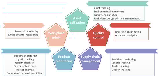 As introduced above, data collected during asset utilization monitoring can be analysed to improve the quality of industrial processes, e.g., through fault detection, predictive maintenance and energy consumption monitoring. Accordingly, critical conditions will be detected and real-time yield optimization solutions will be identified []. Statistical Process Control (SPC), Advanced Process Control (APC) and Six Sigma strategies can be used on such data to enhance process control []. Big data will play a key role, as advanced analysis techniques will be used to compare and interpolate data collected from sensors with related information that is made available on the cloud, so that more efficient solutions can be elaborated []. For example, data collected while monitoring some unusual behaviour of a machine can be analysed with data on the cloud to find similar patterns that suggest possible solutions already implemented by others in similar situations.