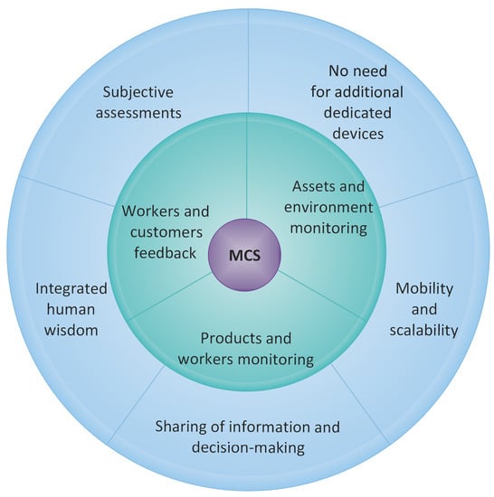 Most of the applications described in Section 3 require a multitude of data to be enabled, data that are later processed according to big data principles, with specific engines such as those described in [,,]. In order to collect these different types of unstructured data coming from such heterogeneous sources, the MCS paradigm can be used. As introduced in Section 2.3, MCS includes both mobile crowdsensing and mobile crowdsourcing. Mobile crowdsensing makes use of mobile sensors to collect data from a crowd of different sources. In mobile crowdsourcing, users are required to complete a task, usually consisting of providing feedback []. As shown in Figure 3, MCS introduces a number of advantages in industrial applications with respect to traditional sensor networks [,]: they make use of ubiquitous Internet access to provide mobile and scalable measures; they do not need additional dedicated devices to extend the existing industrial sensing system, as they use data coming from any device, especially personal devices; they enable the acquisition of subjective assessments, in addition to objective measurements; they can integrate human wisdom into machine intelligence; finally, industrial applications can benefit the information-sharing and decision-making processes of the whole industrial society.