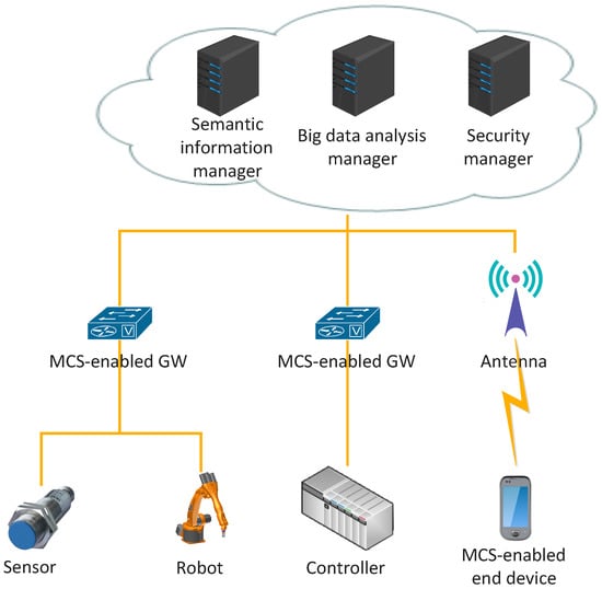 Based on the considerations of the previous sections, in order for MCS to be enabled in Industry 4.0 applications, there are some components that need to be included in traditional industrial communication systems [,,,]. Figure 4 shows an explanatory MCS-enabled Industry 4.0 architecture. The main components are explained in the following: