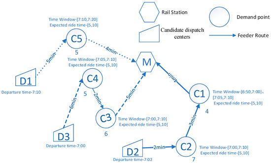 - Passengers at the demand point are allowed to travel in one or several preferred boarding time windows. It is possible to investigate the number of passengers at each demand point around the rail station and ignore the passenger flow between them.