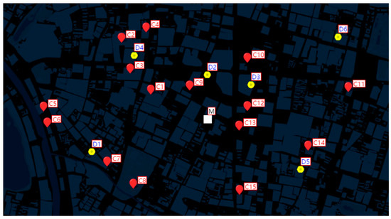 - Randomly choose a dispatch center and let and . For each vehicle k located at the dispatch center , turn to Step 3 to build the route.