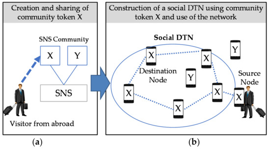 The authors proposed a method in which people (who are assumed to be visitors from abroad) use a community token by interacting with an SNS in [2]. The user creates a community token and uploads it to an SNS. Relay nodes that periodically search for community tokens download uploaded community tokens via the SNS and hold them. After that, users can use a community token to identify terminals that belong to the same SNS community. They can participate in an ad hoc network in the background and use DTN communication.