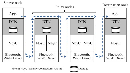 The proposed DTN architecture is shown in Figure 2. The ad hoc communication function uses Nearby Connections API [13] as well as Bluetooth and Wi-Fi Direct to establish a communication link between terminals that share the same community token. After that, a route is established and data communication is started based on the DTN routing protocol.
