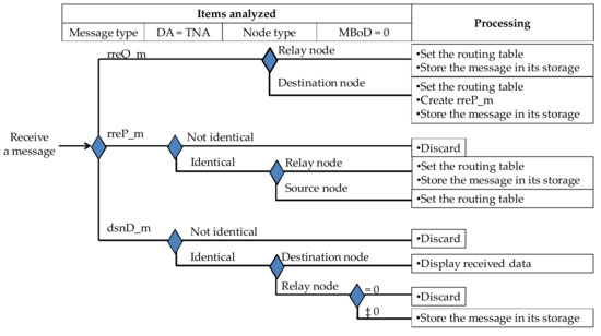 Route establishment operation starts when the source node sends a route establishment request (rreQ_m) to the destination node. A relay node that has received this request creates a routing table entry with the destination node address (DA) in the message as the terminal node address (TNA), and the address of the adjacent node that forwarded this message as the relay node address (RNA). It then forwards the message. The destination node that has received the route establishment request (rreQ_m) creates a route establishment response (rreP_m) with the source node (SA) as its destination and sends it back to the adjacent node from which it has received the route establishment request. A node that has received this message completes the routing table with the source node address as the terminal node address, and the address of the adjacent node that has sent the message as the relay node address. Relay nodes repeat this routing table creation until the route is established up to the source node. After that, the source node sends data messages (dsnD_m), which contain text, image, etc., to the destination node. A relay node selects a relay node with an RNA whose TNA is identical to the DA in the received message (dsnD_m) as the relay node to which it will forward the message. This is repeated until the message reaches the destination node.