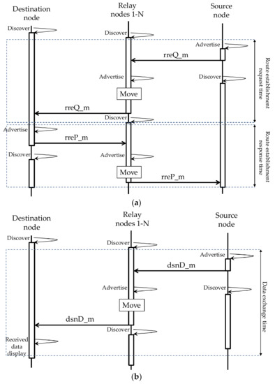The sequence of message exchanges for establishing routes and exchanging data is shown in Figure 5. Since Nearby Connections API [13] is used, the discovery phase and the advertising phase are also shown. Message transmission takes place in the advertising phase while message reception takes place in the discovery phase. “Move” means moving to one of the relay nodes 1 to N. The definitions of route establishment request time, route establishment response time, and data exchange time are also shown in Figure 5.