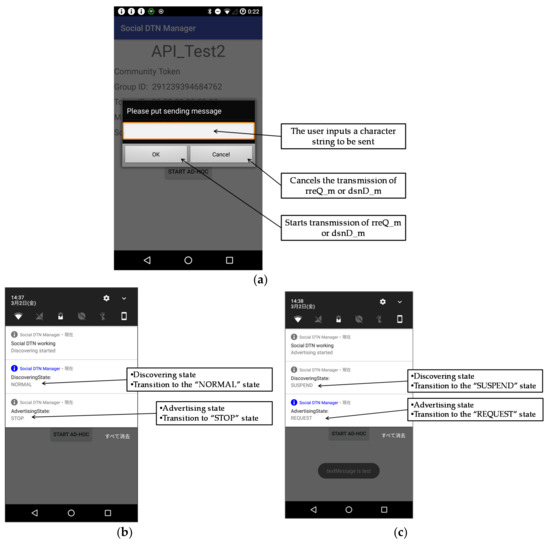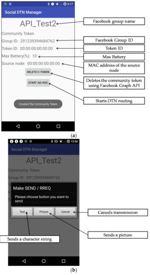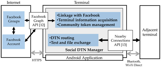 The system configuration of the application is shown in Figure 6. This Android application is mainly written in Java JDK 8. It obtains account information, information about the group the user belongs to and messages generated within the group from Facebook via Facebook Graph API [12]. It also posts or deletes messages. In addition, it makes DTN communication with the social DTN managers on other terminals via Nearby Connections API [13] using Bluetooth or Wi-Fi Direct. Service ID, which is used to authenticate an ad hoc communication link, consists of application package name, Group ID of the community token, and the source node address of the community token.