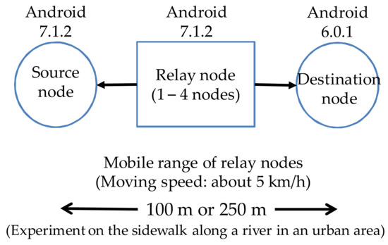To verify the operation of the experimental application, we created and shared a community token through linkage with Facebook and established a route between the source node and the destination node. A character string or an image file registered by the source node was sent to the destination node. The specifications of the terminals used in the experiment are shown in Table 8. The structure of the experimental network is shown in Figure 8. The source node, the destination node and 1 to 4 relay nodes were laid out along a line 100 m long or 250 m long. All terminals had the same community token. The source node and the destination node were fixed, and relay nodes were carried by persons, who walked at a speed of about 5 km/h. A 55-kilobyte-character string was created at the source node and sent to the destination node. A 1-Mbyte image file was also sent.