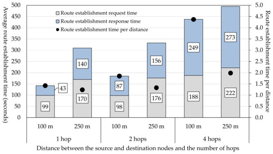 In cases where the distance was 100 m, as the number of hops was increased from one to two, the average route establishment time increased moderately from 142 s to 185 s but when the number of hops was increased to four, the average route establishment time jumped to 437 s. In cases where the number of hops was two, the route establishment time for a distance of 100 m was much shorter than that for a distance of 250 m. However, in cases where the number of hops was four, the route establishment time for a distance of 250 m was 495 s, which was only slightly longer than the route establishment time for a distance of 100 m, which was 437 s. In spite of the fact that the difference in distance was 150 m, the difference in route establishment time was only 58 s. This difference was very small considering that it takes 108 s for a person to walk 150 m at a speed of 5 km/h. The route establishment time per distance for the case of 100 m was much longer than that for the case of 250 m. This indicates that, when there are many other terminals in an area within which a terminal can communicate with another terminal, the route establishment time increases.