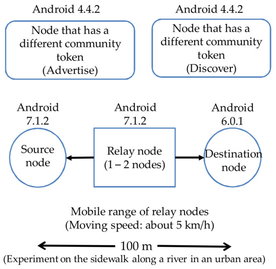 - Hirai, K.; Takami, K. Building a Social MANET based on an SNS Community Token. In Proceedings of the 13th International Symposium on Frontiers of Information Systems and Network Applications (FINA-2017), Taipei, Taiwan, 27–29 March 2017. [Google Scholar]