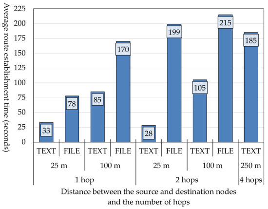 Using the terminals shown in Table 6 and the network structure shown in Figure 8, we measured the route establishment time three times for each of the three patterns (three different numbers of hops). Detailed experimental conditions are shown in Table 9. Relay nodes were located between the source node and the destination node. When a relay node received a message from the source node, the person who held the relay node began to walk. The average values of the measurements are shown in Figure 10.