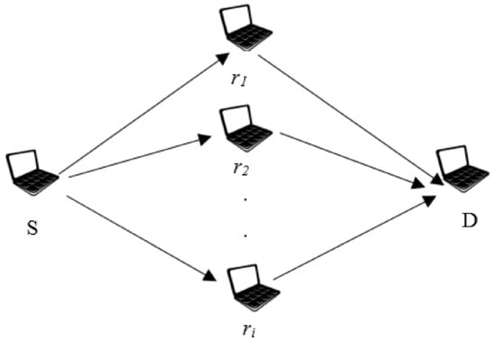 Example of cooperation with several relay nodes. S = source; D = destination.