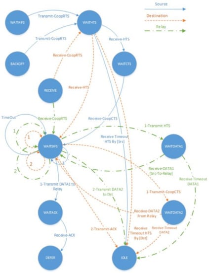 - The mechanism of sending control packets and data packets between the source, relay(s), and the destination is according to the Finite State Machine (FSM) of Figure 2. There exist extra states (e.g., WAITHTS, WAITDATA1, and WAITDATA2) which modify the Distributed Coordination Function (DCF) procedure. Moreover, two new data packets and three control packets are defined for exchanging between source, relay, and destination. The numbering 1 and 2 in Figure 2 refers to two phases of cooperation: 1 = source to relay and 2 = relay to destination.