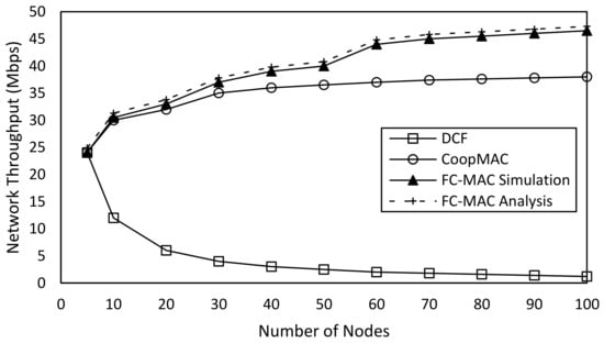The throughput of the FC-MAC protocol is depicted in Figure 3. Comparing the FC-MAC protocol with the IEEE 802.11 DCF and CoopMAC protocols demonstrates the performance improvement of the FC-MAC protocol. Both the CoopMAC and FC-MAC protocols have better performance than the DCF protocol. When the number of nodes increases, the spectrum efficiency provided by the FC-MAC protocol is greater than the CoopMAC protocol because the FC-MAC protocol exploits the capacity of spectrum efficiency provided by all existing relay nodes, whereas the CoopMAC protocol is limited to the best relay node which presents the lowest transmission delay.