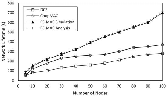 The network lifetime improvement of FC-MAC can be seen in Figure 4 when the number of nodes changes. As expected, the CoopMAC protocol achieves the shortest lifetime because the best relay nodes always forward packets for other nodes. The continual use of the best relay nodes in cooperation results in relay node outage and a reduction of network lifetime. The energy of each node in the DCF protocol is only consumed by direct transmission to the destination and there is no overhearing and forwarding due to cooperation. Therefore, the lifetime of the DCF protocol indicates better performance in comparison to the two other protocols. The relay selection scheme of the FC-MAC protocol provides balanced energy consumption. The FC-MAC protocol exploits the energy capacity of all nodes in the network. Thus, its lifetime outperforms the CoopMAC protocol while the forwarding mechanism leads to its degradation in comparison to the DCF protocol.