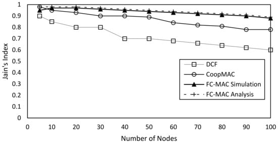 Figure 5 indicates the time fairness of the FC-MAC, CoopMAC, and DCF protocols as the number of nodes increases. It can be observed that FC-MAC provides better time fairness than the other schemes. Since DCF and CoopMAC are not designed for time fairness, their fairness index is lower than that of FC-MAC. This is due to the fact that FC-MAC improves the time fairness based on high utilization of all existing relay nodes. Hence, all relay nodes with different cooperation gains have more chance to participate in cooperation and forwarding the packets.
