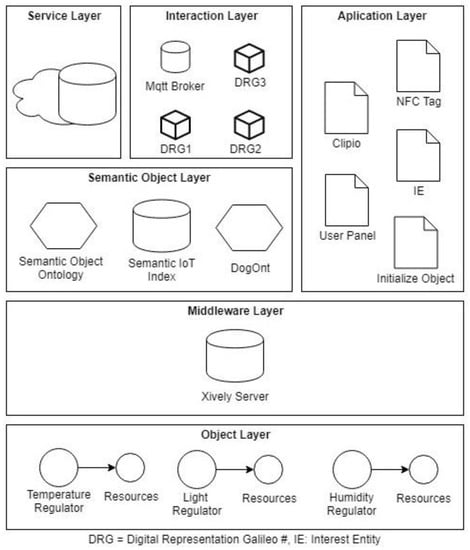 The service layer exposes the results of the semantic index using web services based on SOAP [], making it possible for applications and objects to consume metadata, data, and other context information, in an interoperable and transparent manner. This server is also responsible for recovering the digital representation of the objects in Xively and exposing it in the semantic index. There is a semantic index for each specific domain ontology that is provided on the cloud server.
